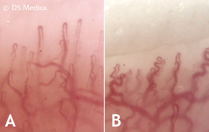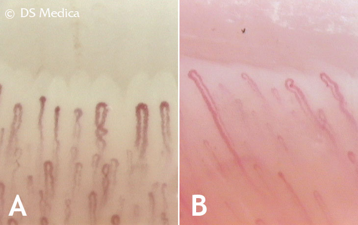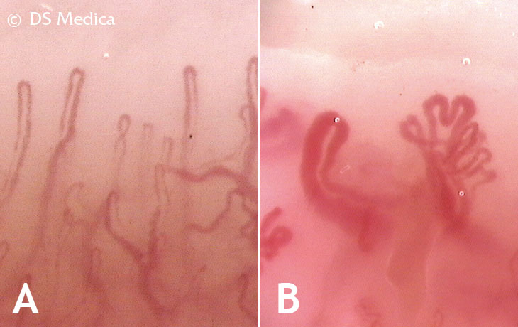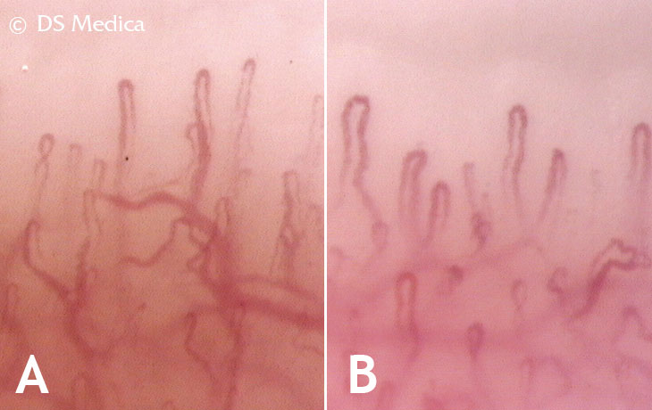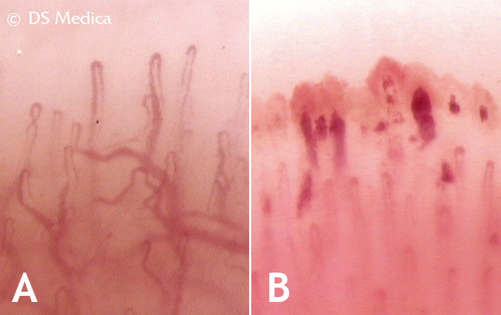 Già nelle fasi iniziali della patologia sclerodermica, quando è presente come unico sintomo il fenomeno di Raynaud, si possono apprezzare alterazioni tipiche capillaroscopiche. Nella forma diffusa della malattia, a più squisita impronta fibrotica, rapidamente evolutiva, con precoce e significativa incidenza di fibrosi polmonare, impegno renale, gastrointestinale e miocardico, la capillaroscopia riflette il carattere di aggressività che si manifesta con gravi e polimorfe atipie dei capillari che tendono ad una rapida riduzione.