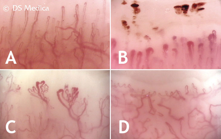 B - C - D - Quadri capillaroscopici rappresentativi delle alterazioni della rete capillare osservabili nella patologia sclerodermica: fenomeni trombo-emorragici, angiogenesi, sovvertimento architettonico della rete e riduzione della densità capillare.